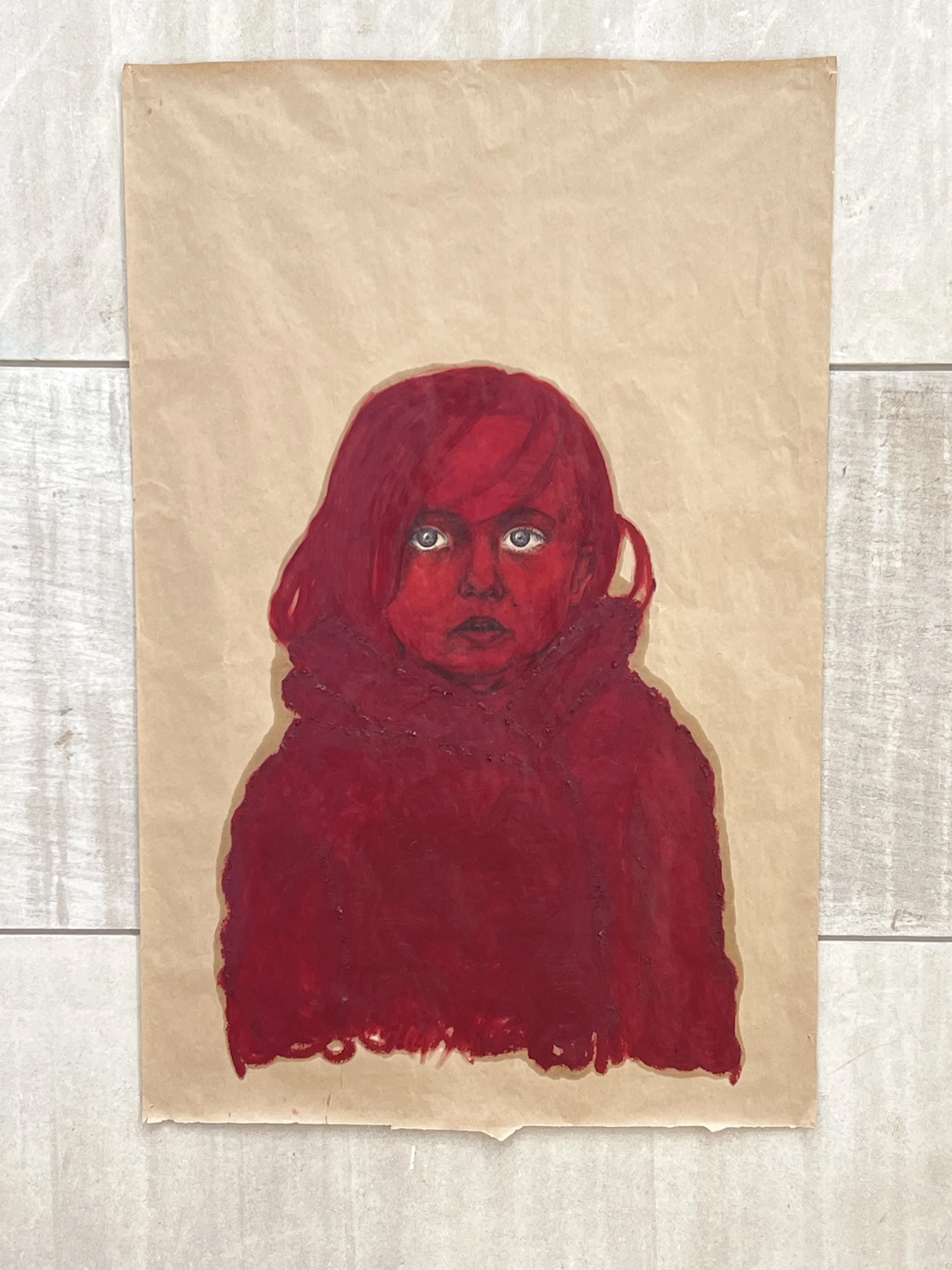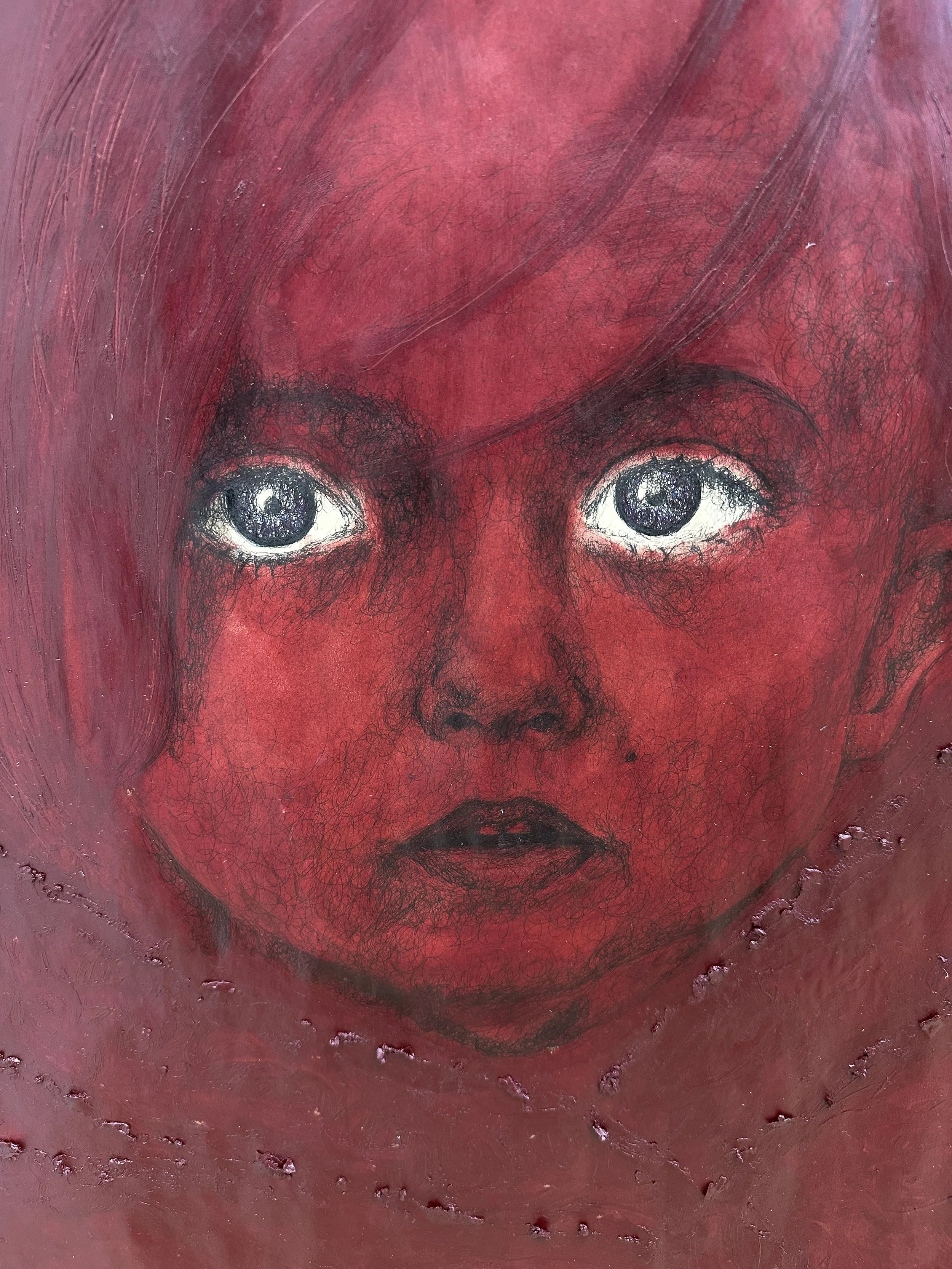 As a child I had a habit of not smiling in photos, instead making deadpan eye contact with the camera. While sorting through the archive of childhood photos this stare began to become unsettlingly confrontational, especially coupled with the guilt I was already feeling. The unflinching gaze of my child self inspired this piece.